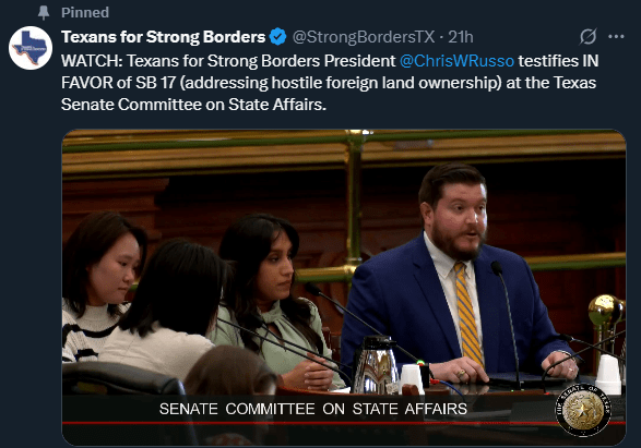 Texans for Strong Borders also supports a general prohibition on foreign land acquisition in Texas instead of denying sales to just a few nations.